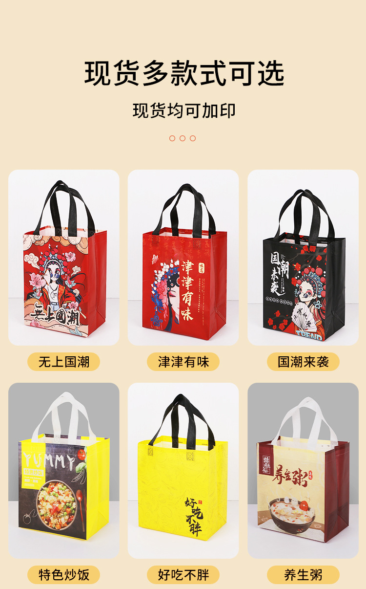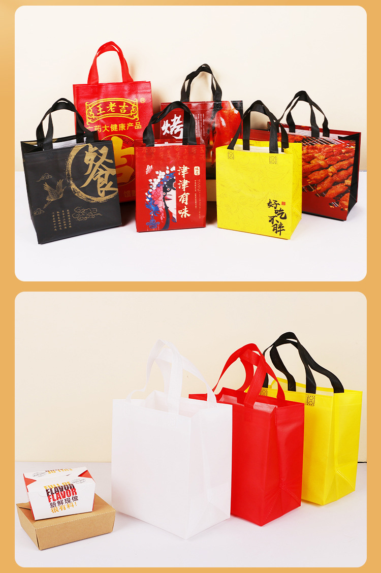 • 环保性:无纺布覆膜外卖袋是一种环保产品,客户在选择材质和设计时,应考虑到环保因素,尽可能选择可回收、可降解的材料。